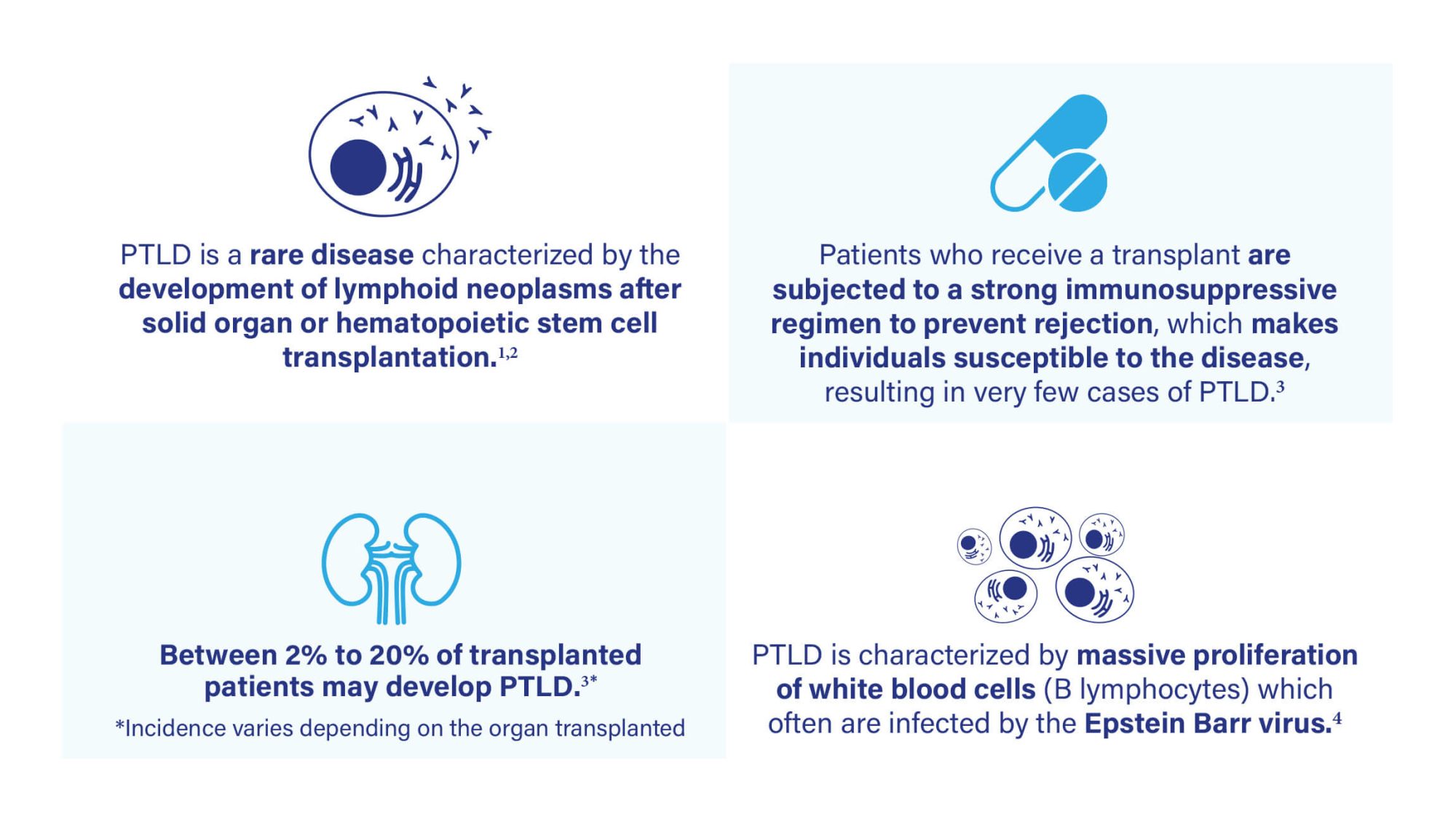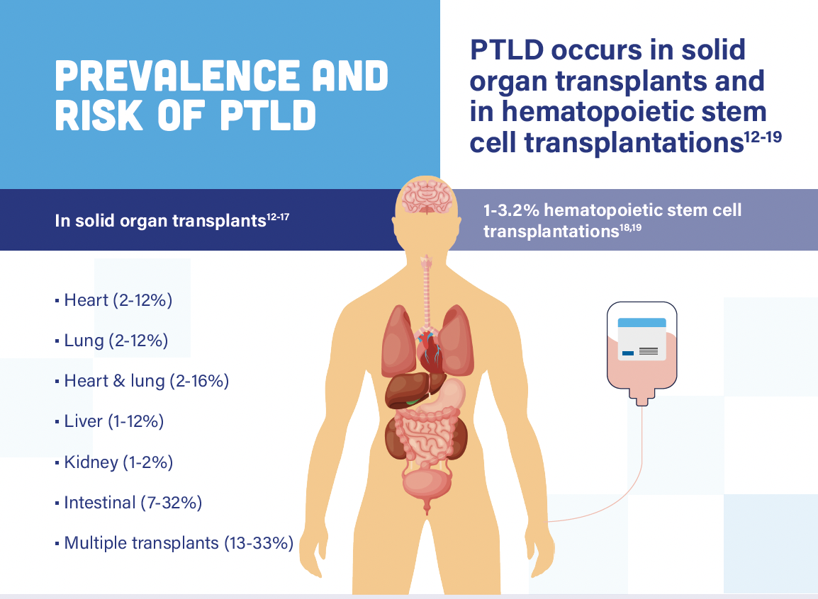 Patiënten die na een transplantatie medicijnen gebruiken om afstoting te voorkomen hebben een kans om PTLD te ontwikkelen.3 PTLD is een zeer zeldzame vorm van bloedkanker.
